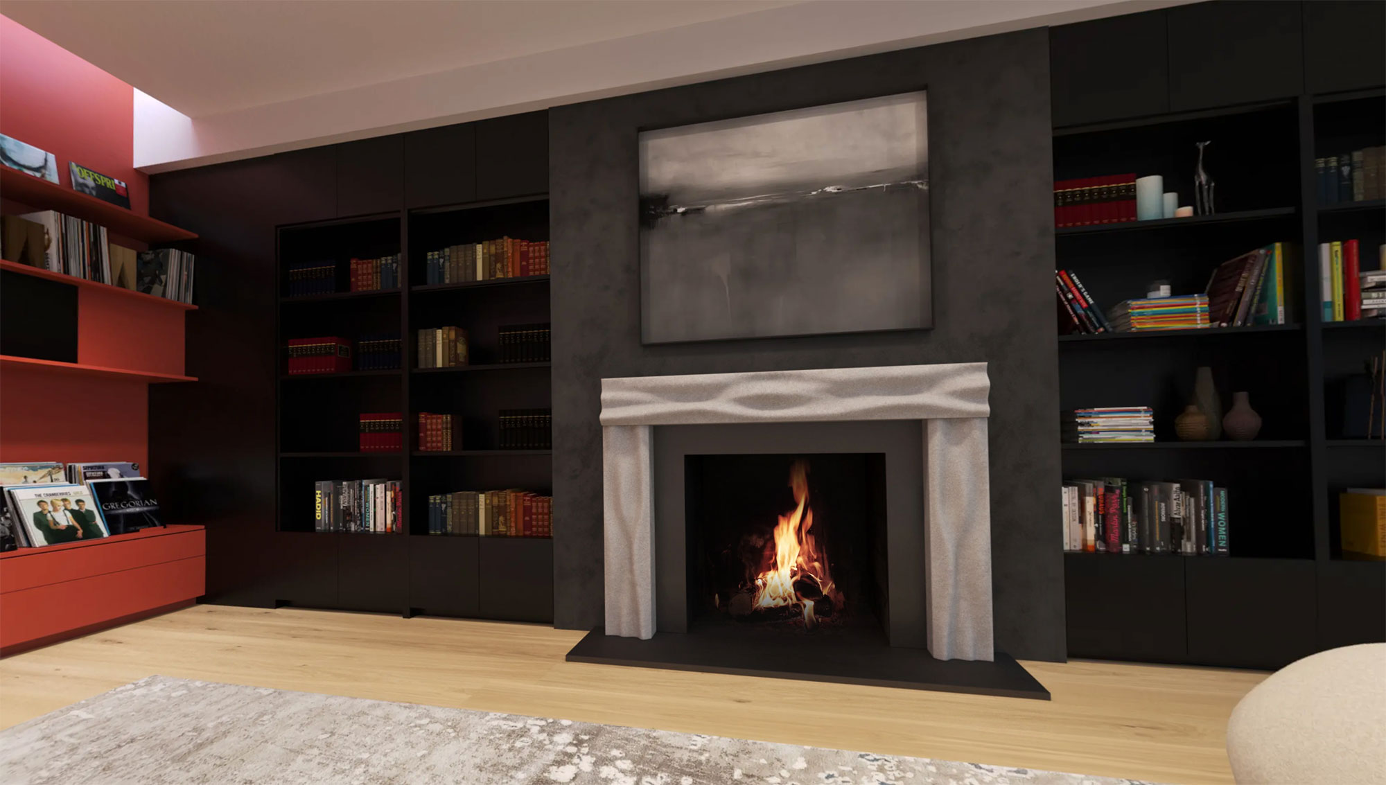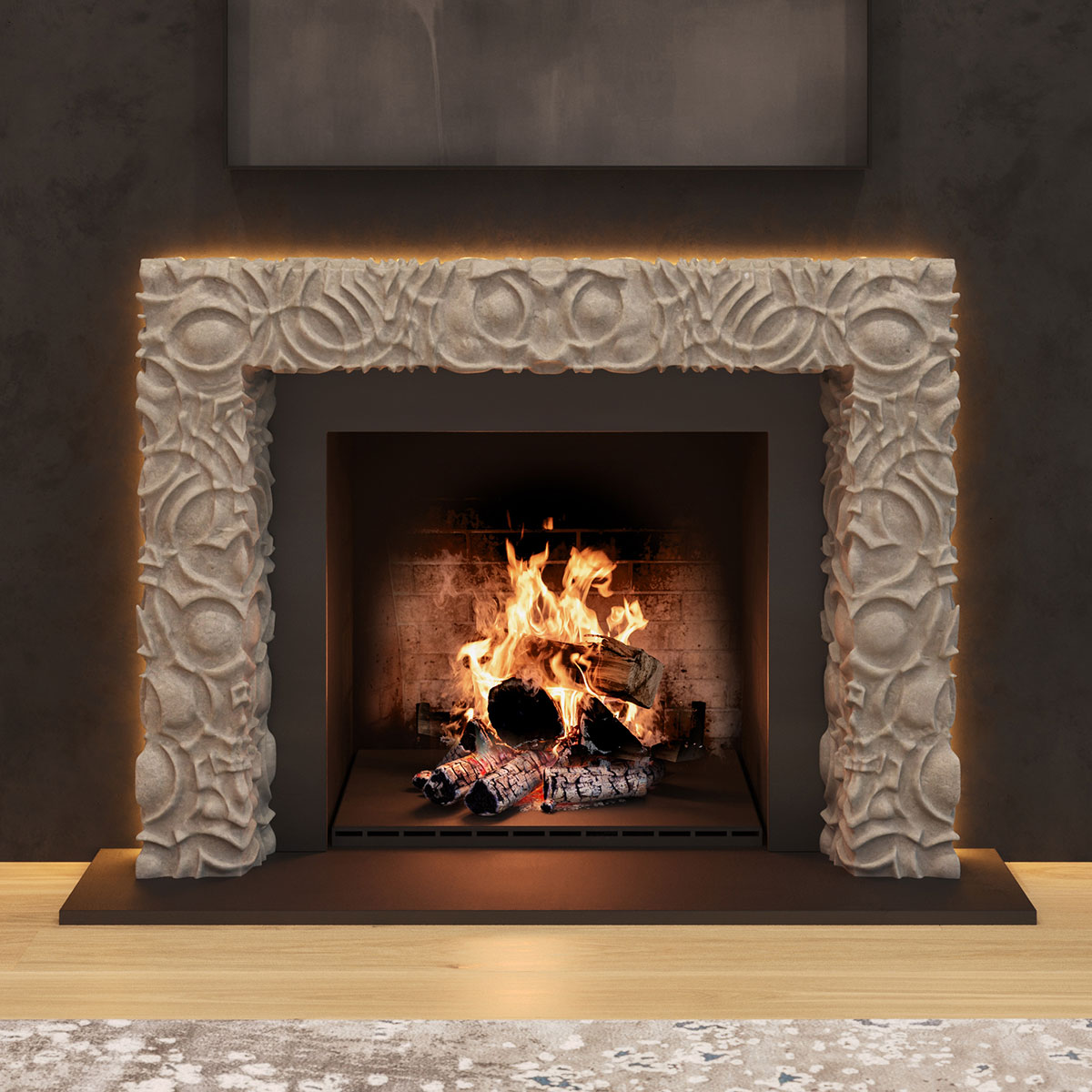The hearth becomes a conversation between the wild and the refined, where fire meets the quiet permanence of stone and creates an aesthetic that feels grounded, alive, and quietly breathing within the space.